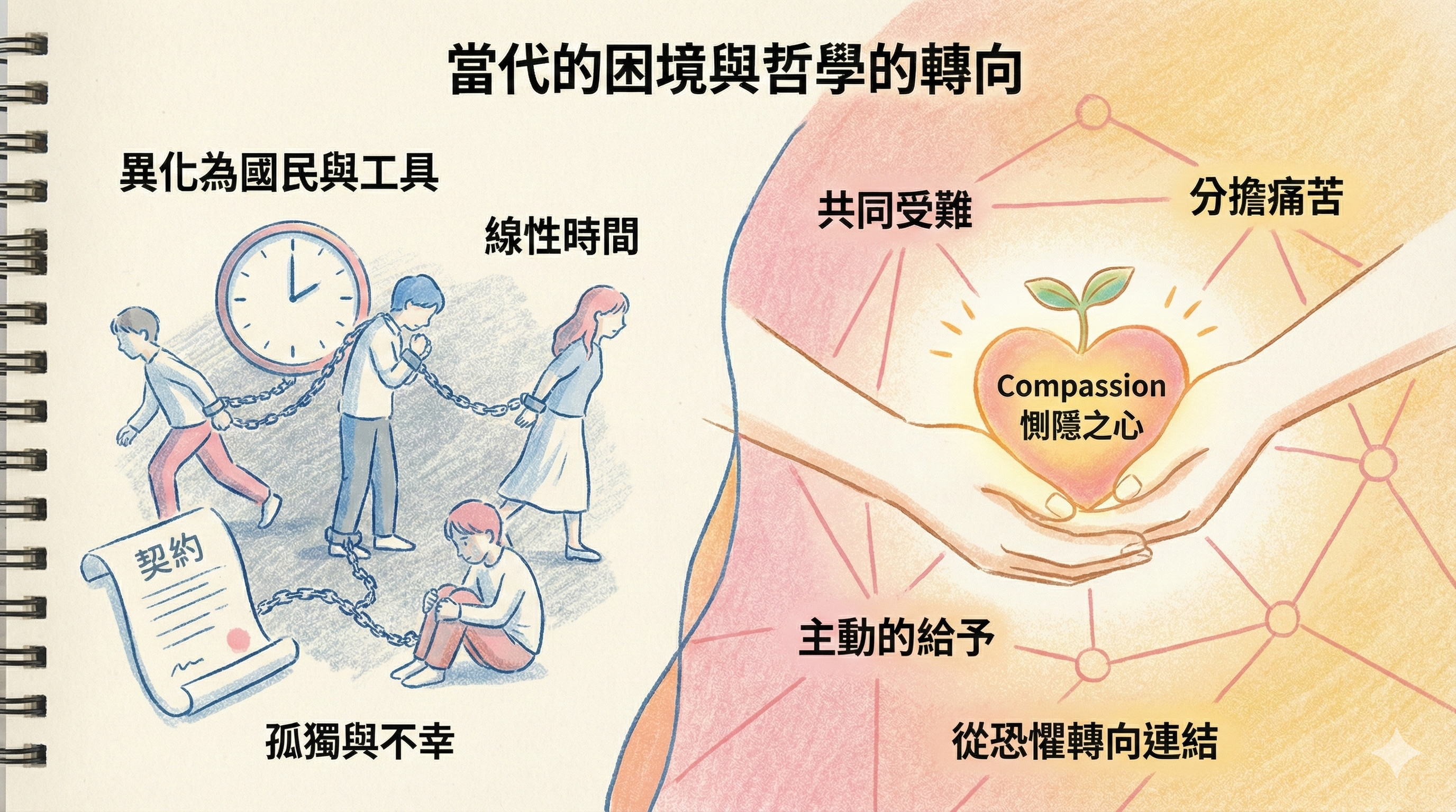這意味著我們不再對他者冷漠,而是將他者的苦難視為己任,主動將被社會「拋擲(Thrownness)」的被動性轉化為能動的創造。我們不再是因為害怕受傷而締結冷冰冰的法律契約,而是因為「看見了他人的痛苦」,而自然地伸出援手。