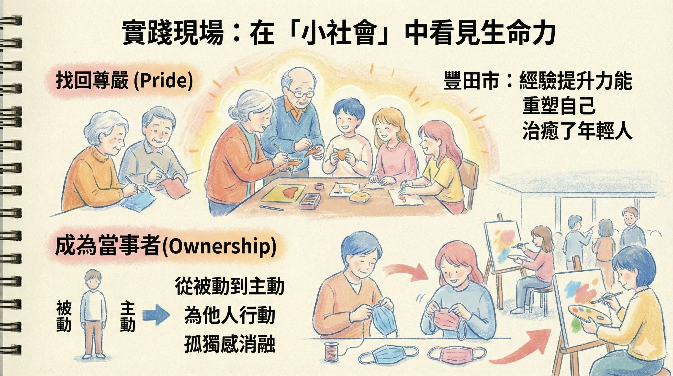 找回尊嚴(Pride):在豐田市旭地區,曾經自嘲是被時代遺棄的老人們,在與年輕人的互動中,感受到自己的經驗能提升對方的「力能」,從而找回了生存的尊嚴,不僅治癒了年輕人,也重塑了自己。