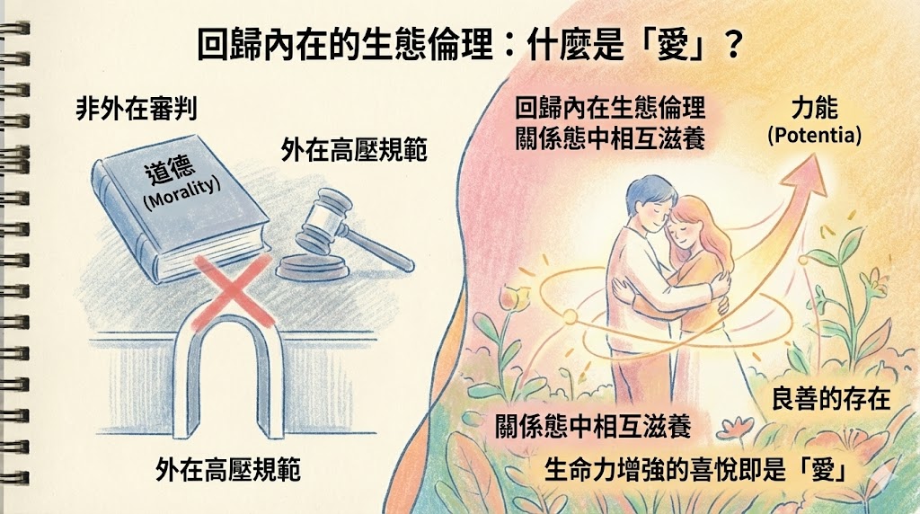 這種轉向不需要依靠外在高壓的規範。牧野教授強調,這種轉變並非依賴外在超越的「道德(Morality)」審判,而是回歸史賓諾沙(Baruch de Spinoza)式的內在「生態倫理(Ethology)」:當我們在與他人的「關係態」中,互相提升彼此維持生存的「力能(Potentia)」時,那種生命力增強的喜悅即是「愛」。