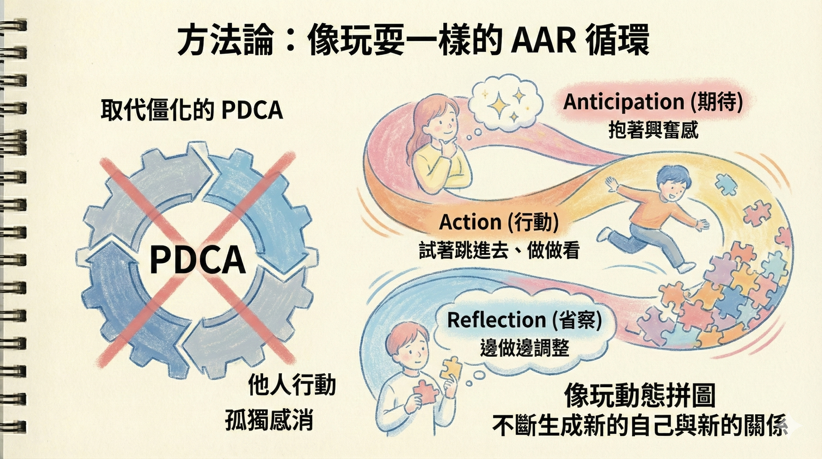 為了在生活中實踐這種倫理,牧野教授提倡一種更具生命力的 AAR 循環,取代僵化的 PDCA(意指Plan 計畫、Do 執行、Check 檢查、Act行動):