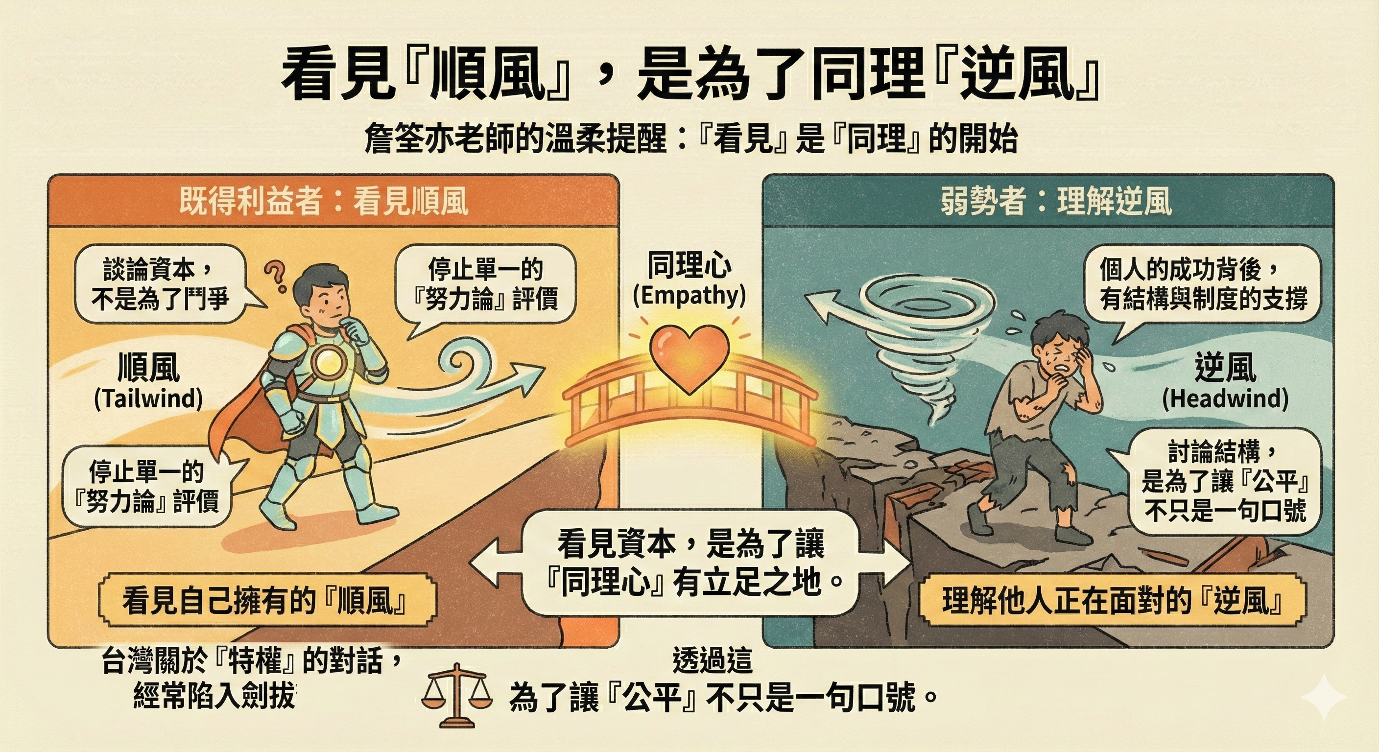 看見自己擁有的『順風』,進而理解他人正在面對的『逆風』......看見資本,是為了讓『同理心』有立足之地;討論結構,是為了讓『公平』不只是一句口號。」