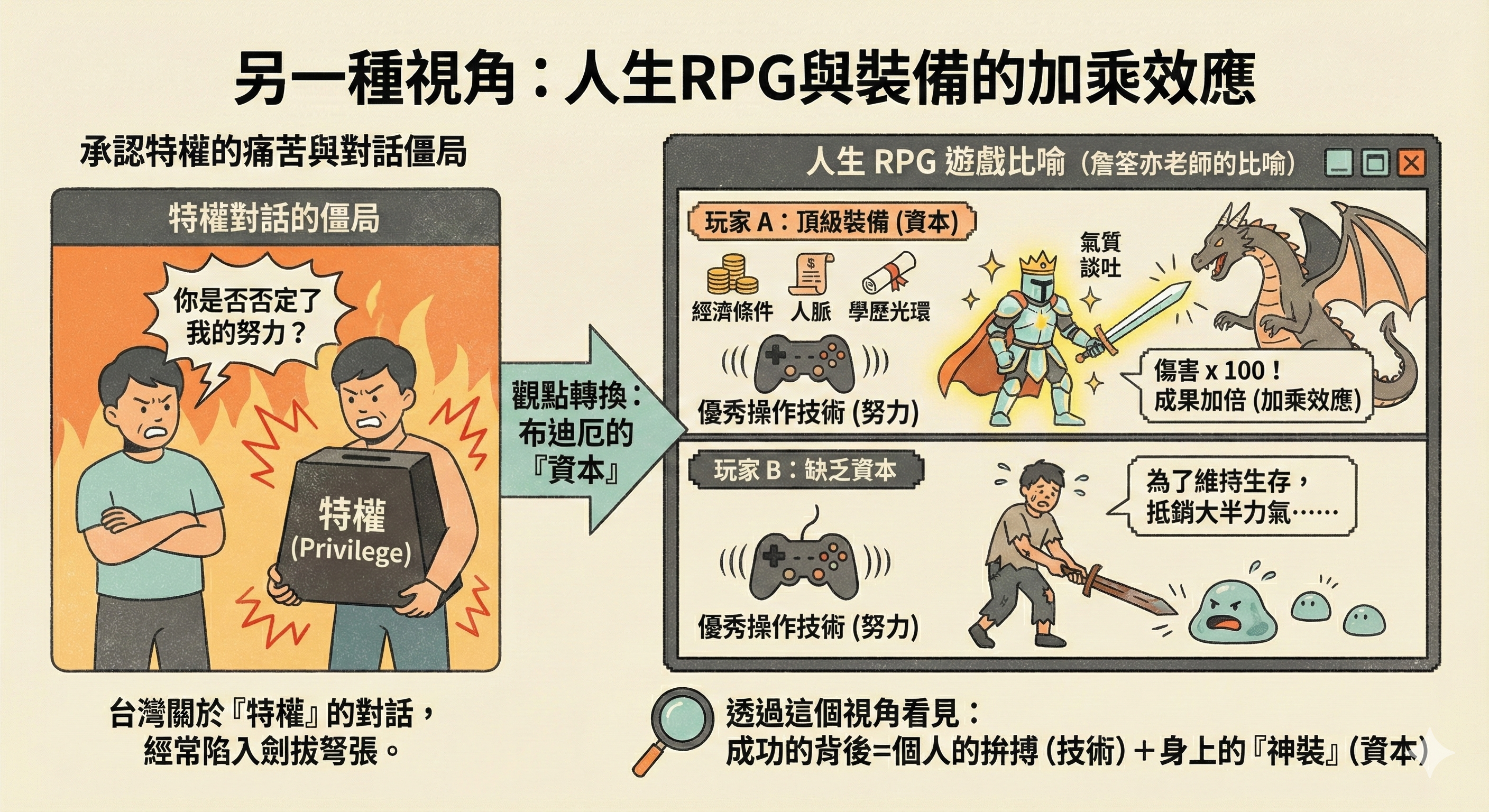 對此,內湖高中國文科詹筌亦老師(aka 貍想教育柴柴老師)提供了一個非常精妙的比喻,或許能幫助我們卸下心防。他建議將沉重的「特權」一詞,轉換為社會學家布迪厄(Pierre Bourdieu)所說的「資本」。