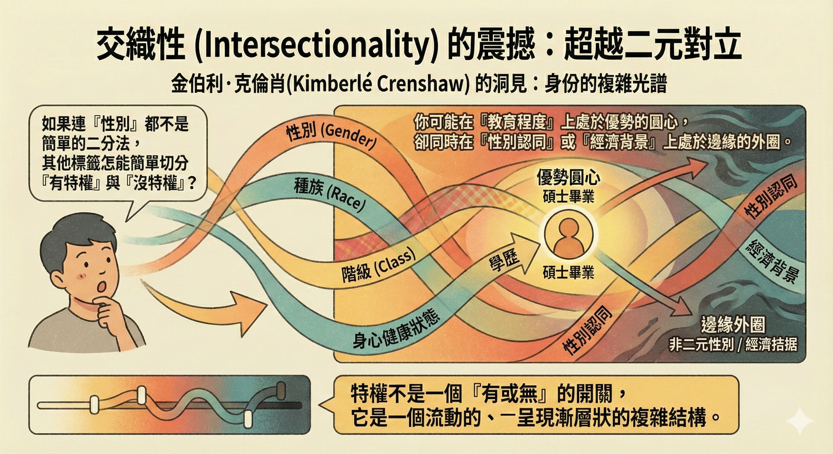 這正是法律學者金伯利·克倫肖(Kimberlé Crenshaw)提出的「交織性」(Intersectionality)。我們的身份是由無數條線交織而成的複雜光譜。你可能在「教育程度」上處於優勢的圓心(例如碩士畢業),卻同時在「性別認同」或「經濟背景」上處於邊緣的外圈。
