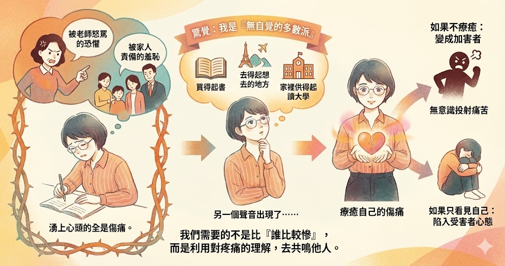 我們需要的不是去比「誰比較慘」,而是凝視自己的傷口、療癒它,然後利用這份對疼痛的理解,去共鳴他人身上那深刻的傷口。