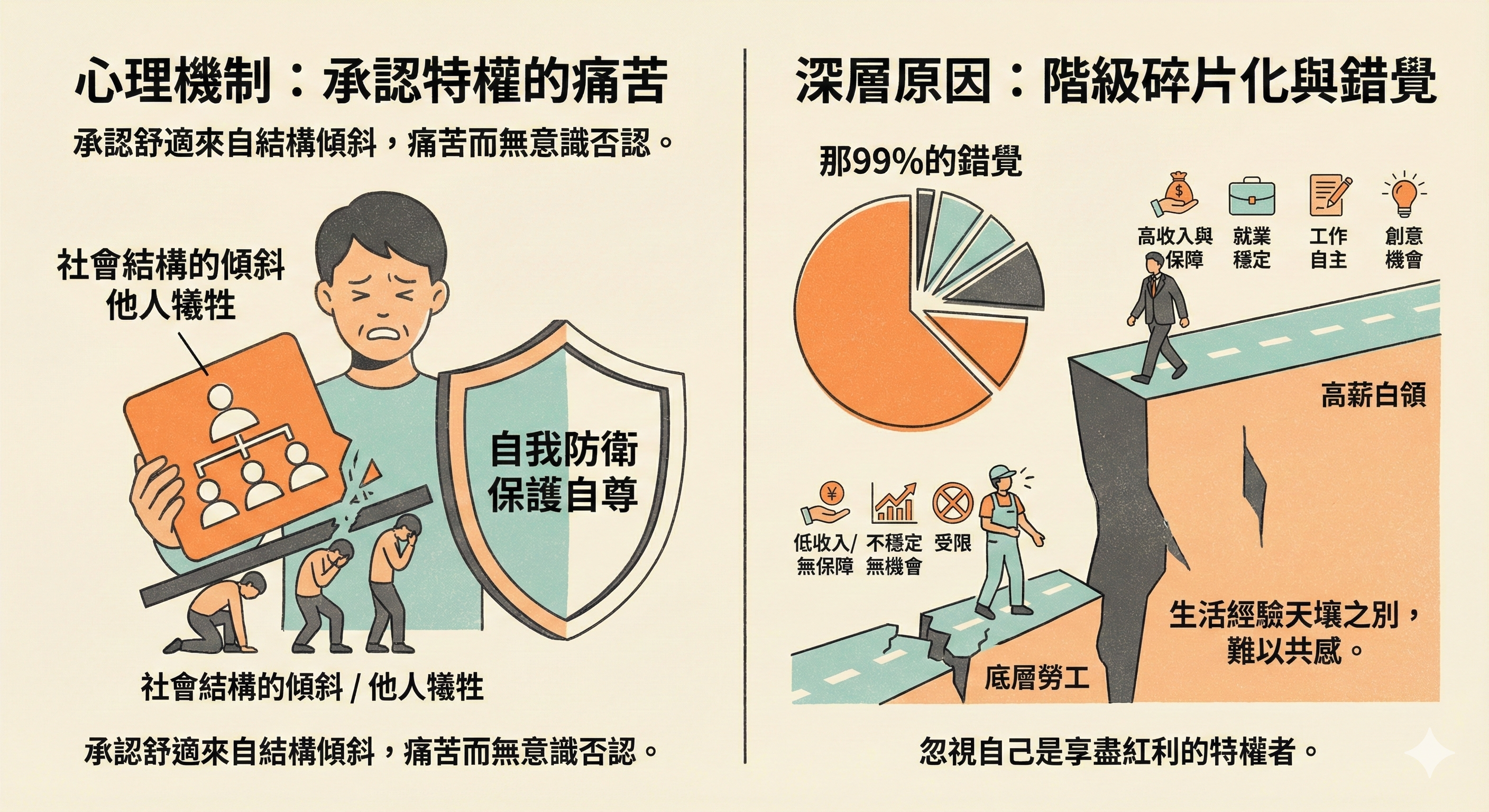 這四個面向上有著天壤之別。這種生活經驗的零碎化,削弱了我們對彼此命運的共感。高薪白領很難想像底層勞工的焦慮,因為雙方的階級結構已經複雜到難以單純用「勞資對立」來解釋。正是這種複雜性,讓我們很容易忽視自己其實在某些層面上,已經是享盡紅利的「特權者」。