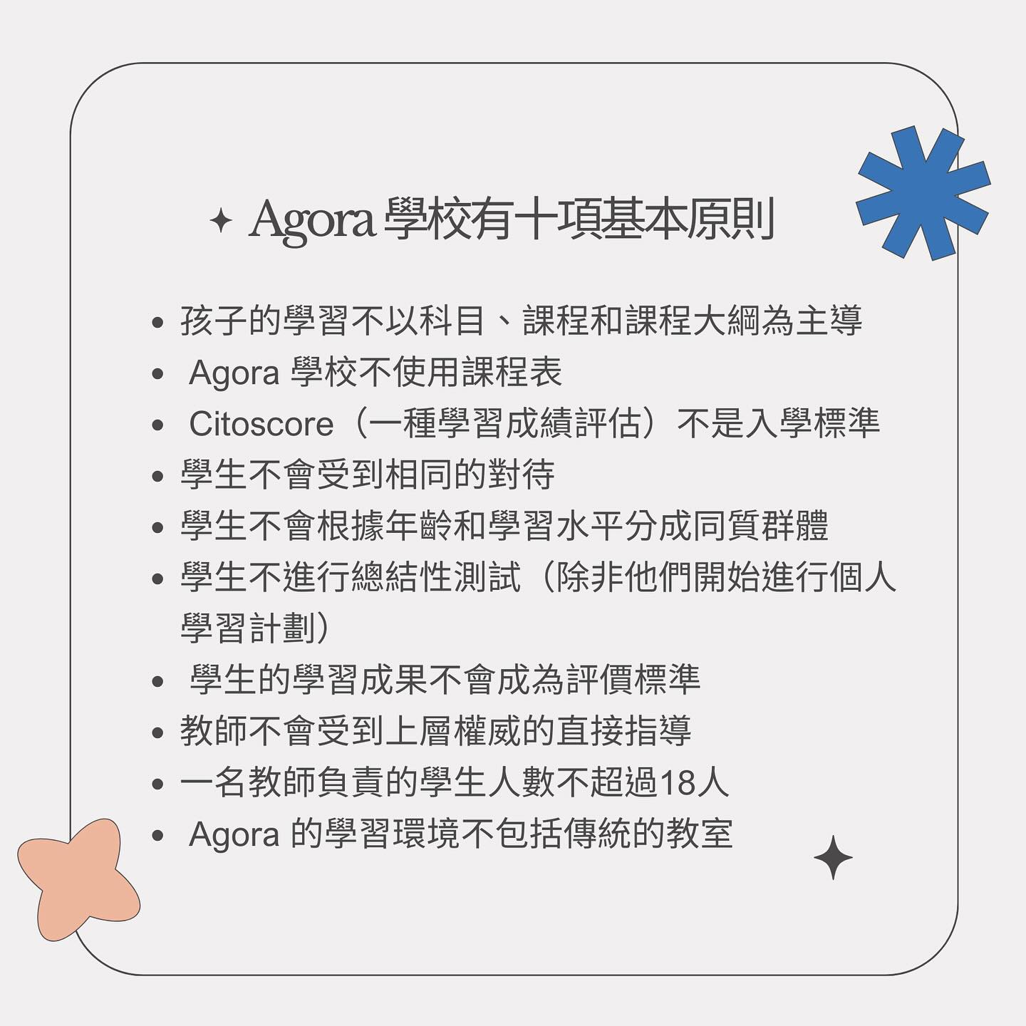 Agora 為希臘語中的市集,原意指古希臘羅馬城中人們聚集、交易、討論事物的社會經濟文化中心。Agora 期待學生能在這裡相遇,增長自我認知、發現自己的力量、熱情和前所未見的可能性。