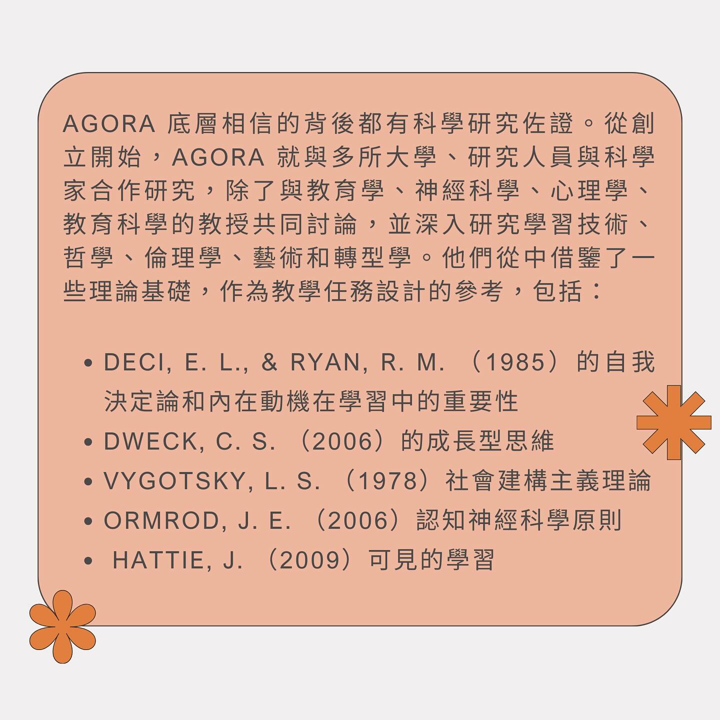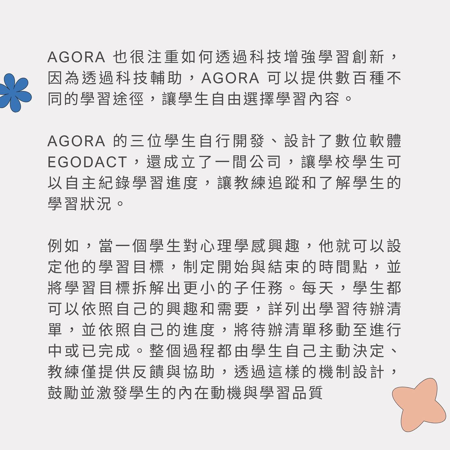 在Agora,我們相信所謂的成功是『對社會的貢獻』而不是學業成就,也就是『共同成功和讓彼此幸福的使命』,成功不是個人的功勞,所以成功的人有責任給予其他人實現成功的機會。